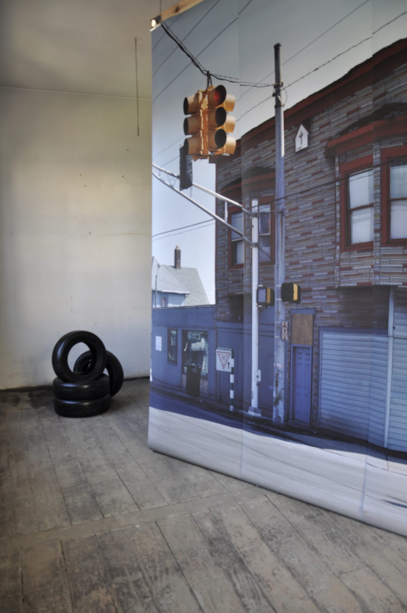 On the wall opposite the large photograph is a smaller framed photograph of similarly stacked tires from an online advertisement. The frame has two-way mirror glass so that when it is seen straight on it reflects the photograph of the building, the street and the viewer.